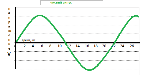Чистая синусоида создаёт правильное круговое магнитное поле, где отсутствуют искривления, искажения, всплески. Ниже показана схема формы тока с чистой синусоидой.