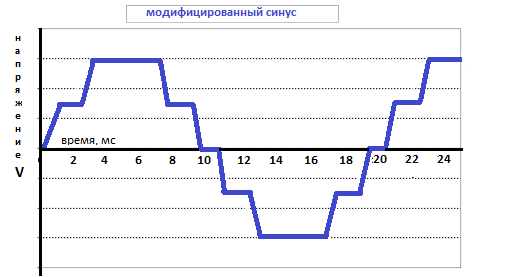 Инверторы низкочастотные и высокочастотные, синусоидальные и модифицированныеСлово 'инвертор' происходит от английского глагола 'invert' – преобразовать, вывернуть. Одной из главных функций данного устройства является преобразование входящего в него постоянного тока в переменный на выходе. А также по необходимости изменение вольтажа выходящего тока. Существует два типа инверторов: низкочастотные и высокочастотные. В низкочастотных инверторах используется частота преобразования энергии в 50 Гц. В высокочастотных — обычная частота от 15 000 до 30 000 Гц. Плюсы низкочастотных инверторов: • они не фонят, • имеют большую мощность. Минусы: • имеют большие размеры и вес. Плюсы высокочастотных инверторов: • малогабаритны • относительно дешевы. Минусы: • излучают больше электромагнитных помех. Ещё один важный элемент - это синусоида, выдаваемая инвертором. Существует модифицированная и чистая синусоида. Тут также есть свои преимущества и недостатки. Модифицированная синусоида образуется при наличии резких бросков, скачков в магнитном поле. Ниже показана схема форма тока с модифицированной синусоидой.